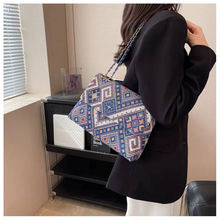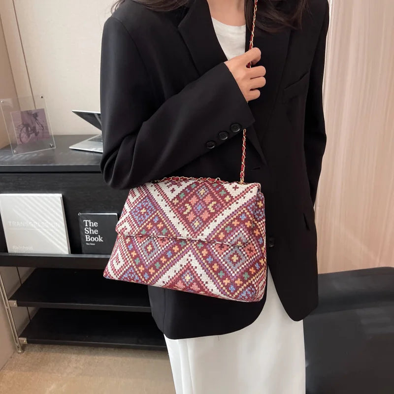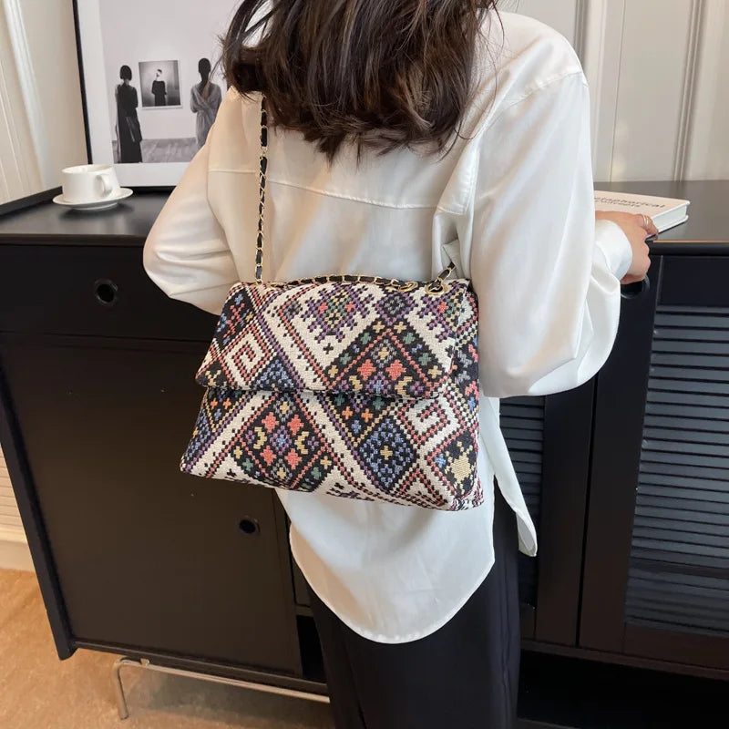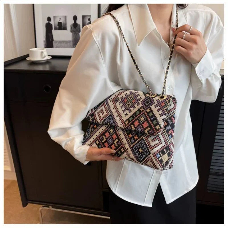 The Soul Stitch blends artisanal charm with everyday function. Its richly patterned fabric, spacious interior, and comfortable chain strap make it your go-to for errands, brunches, and everything in between.