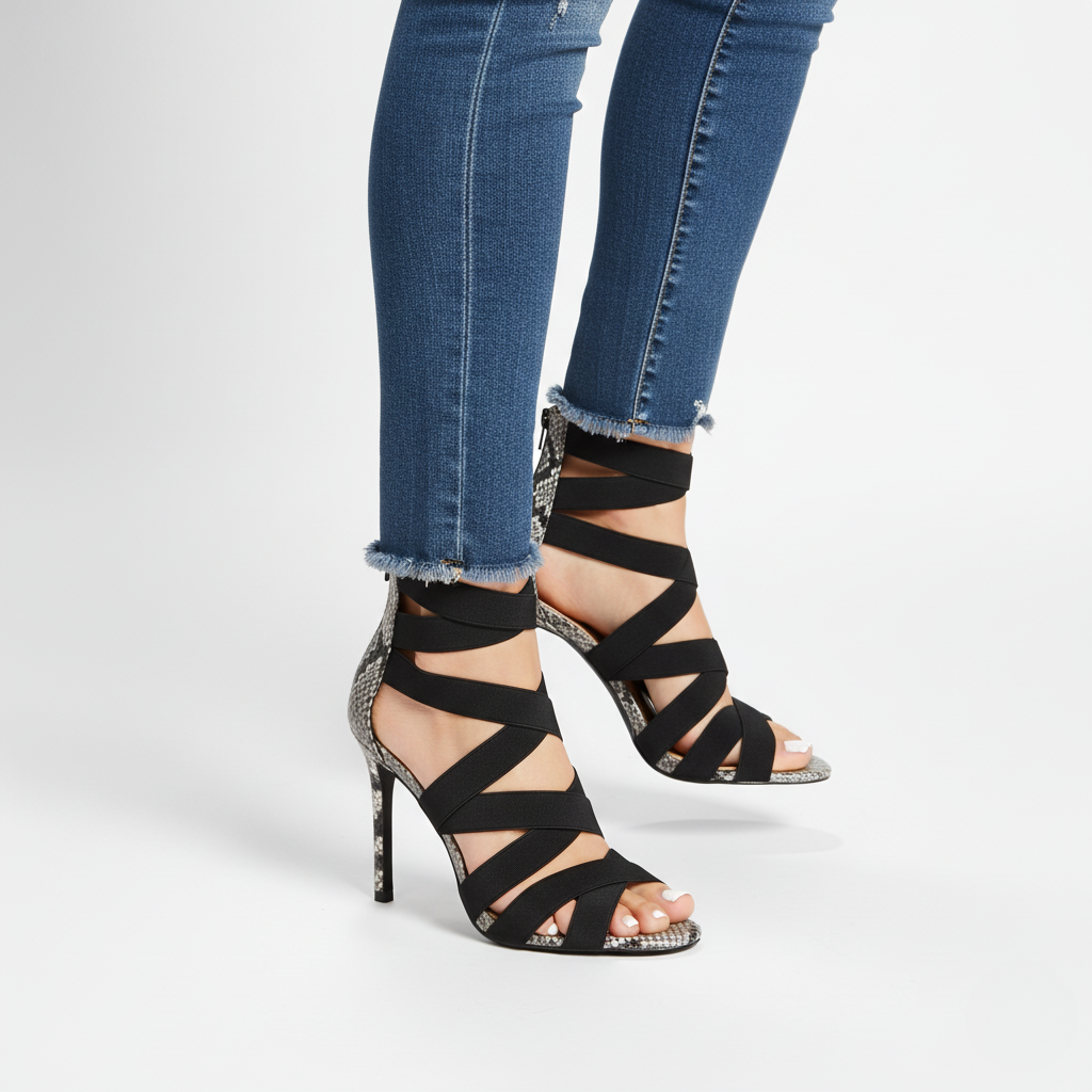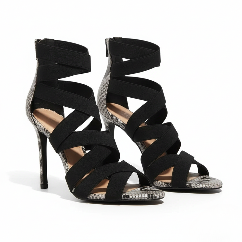 Designed for bold evenings and city lights — Jora Strata blends structured form with supple comfort, wrapping your foot in soft stretch bands and luxe texture. Every step feels deliberate, grounded in strength and style. The sculpted heel and snakeskin accent add subtle edge, while the flexible straps move effortlessly with you — from dinner reservations to midnight strolls. An elevated essential for women who dress to command attention, not chase it.
